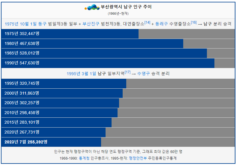 남구 인구는 1975년 35만명 이었습니다. 그리고 1985년 인구가 처음으로 50만명을 돌파했습니다. 이후 남구 일부지역이 수영구로 승격 분리되면서 1995년 32만명 이하로 감소했습니다. 2023년 현재 25만명이 남구에 거주하고 있습니다.