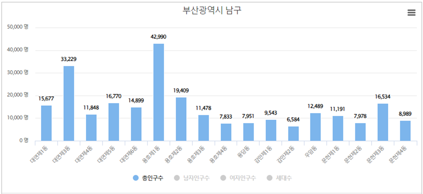 남구에서 용호제1동이 인구가 가장 많으며 인구는 42,990명, 세대수는 17,126입니다. 두번째로는 대연제3동 인구가 많고 인구 33,229명, 세대수는 16,655입니다. 세번째는 용호제2동으로 인구는 19,409, 세대수는 8,069입니다.