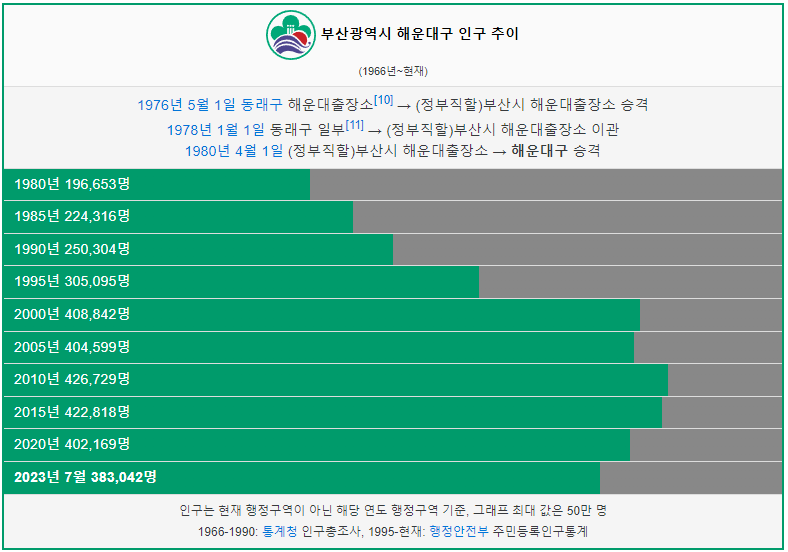 해운대구 인구는 1980년 19만명 이었습니다. 그리고 2000년 인구가 처음으로 40만명을 돌파했고 이후 인구가 조금씩 감소했습니다. 2023년 현재 38만명이 해운대구에 거주하고 있습니다.