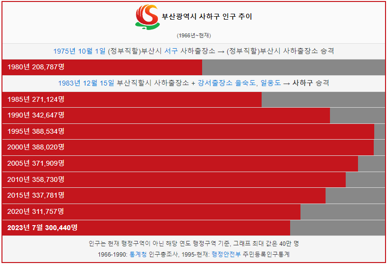 사하구 인구는 1980년 20만명 이었습니다. 그리고 1995년 가장 많은 인구인 38만명이 거주했고 이후 인구가 조금씩 감소했습니다. 2023년 현재 30만명이 사하구에 거주하고 있습니다.