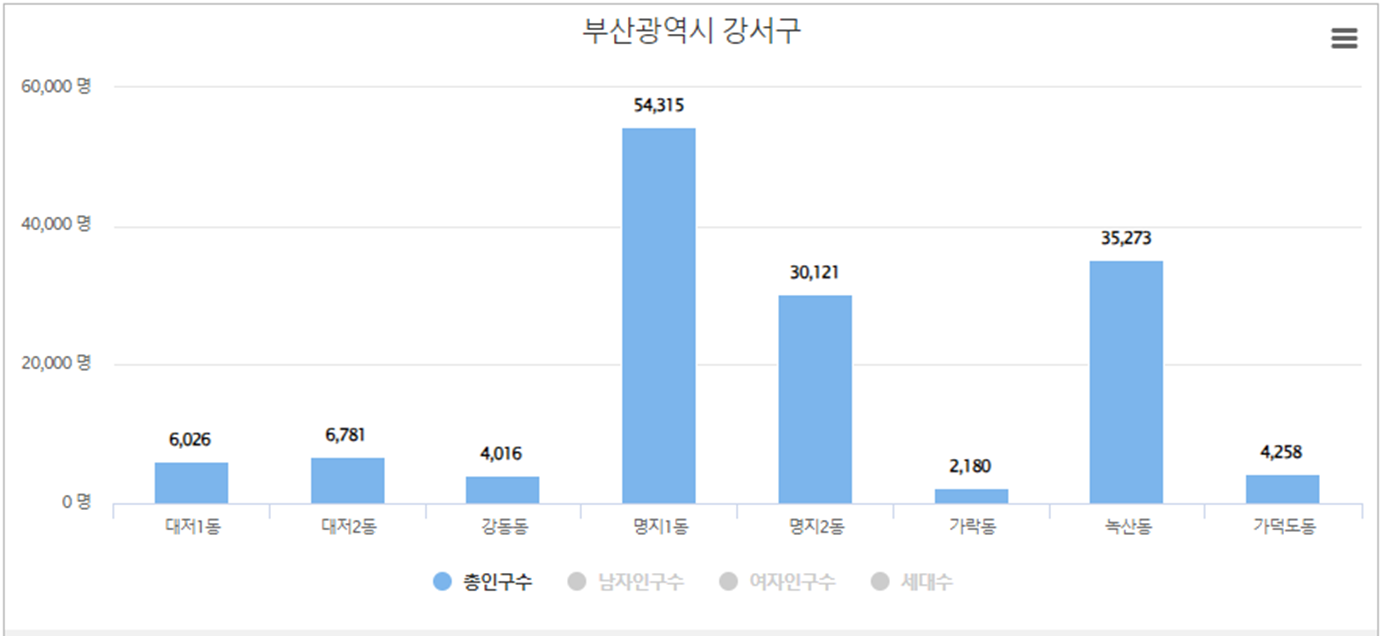 강서구에서 명지1동이 인구가 가장 많으며 인구는 54,315명, 세대수는 21,408입니다. 두번째로는 녹산동 인구가 많고 인구 35,273명, 세대수는 17,112입니다. 세번째는 명지2동으로 인구는 30,121, 세대수는 10,413입니다.