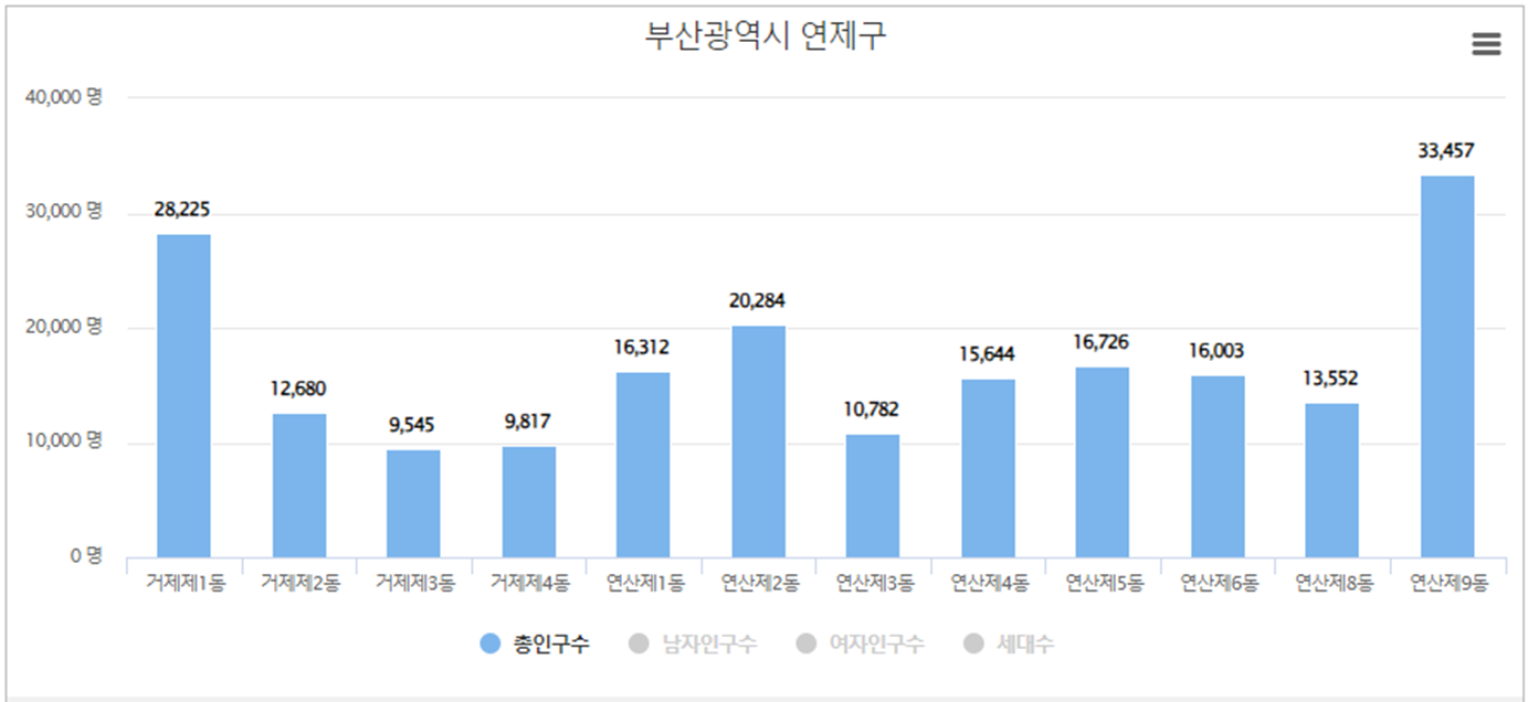 연제구에서 연산제9동이 인구가 가장 많으며 인구는 33,457명, 세대수는 14,411입니다. 두번째로는 거제제1동 인구가 많고 인구 28,225명, 세대수는 11,283입니다. 세번째는 연산제2동으로 인구는 20,284, 세대수는 9,220입니다.