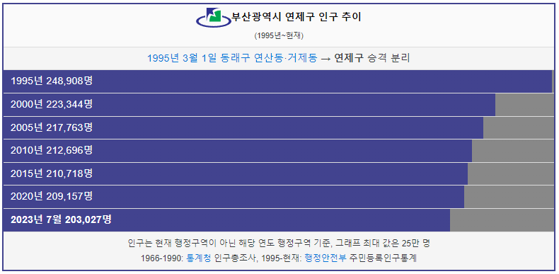 연제구 인구는 1995년 24만명 이었습니다. 이후에 인구가 꾸준하게 감소하여 2023년 현재 20만명이 연제구에 거주하고 있습니다.