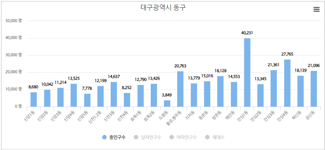 동구에서 안심1동이 인구가 가장 많으며 인구는 40,231명, 세대수는 19,529입니다. 두번째로는 안심4동 인구가 많고 인구 27,765명, 세대수는 11,772입니다. 세번째는 안심3동으로 인구는 21,361, 세대수는 8,627입니다.