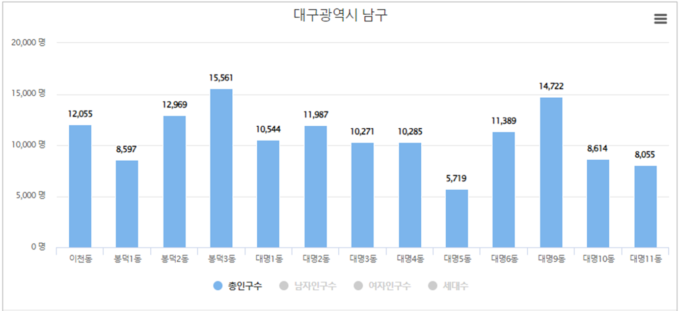 남구에서 봉덕3동이 인구가 가장 많으며 인구는 15,561명, 세대수는 8,118입니다. 두번째로는 대명9동 인구가 많고 인구 14,722명, 세대수는 8,247입니다. 세번째는 봉덕2동으로 인구는 12,969, 세대수는 5,726입니다.