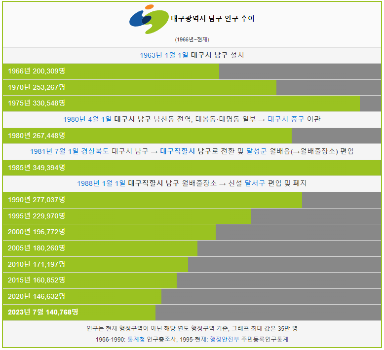 남구 인구는 1966년 20만명 이었습니다. 그리고 1985년 인구가 처음으로 35만명을 돌파했고 이후에 인구가 계속해서 감소했습니다. 2023년 현재 14만명이 남구에 거주하고 있습니다.
