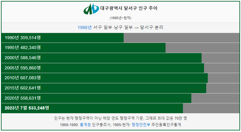 달서구 인구는 1990년 35만명 이었습니다. 그리고 2010년 인구가 처음으로 60만명을 돌파했고 이후에 인구가 계속해서 감소했습니다. 2023년 현재 53만명이 달서구에 거주하고 있습니다.