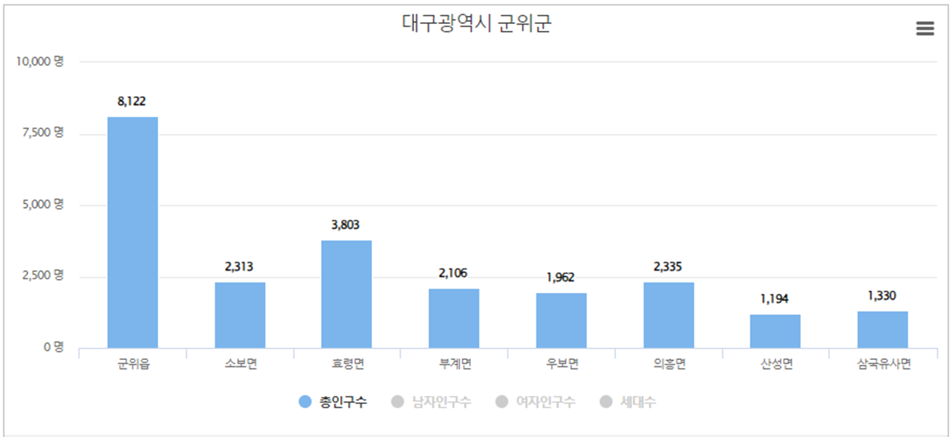 군위군에서 군위읍이 인구가 가장 많으며 인구는 8,122명, 세대수는 4,382입니다. 두번째로는 효령면 인구가 많고 인구 3,803명, 세대수는 2,257입니다. 세번째는 의흥면으로 인구는 2,335, 세대수는 1,454입니다.