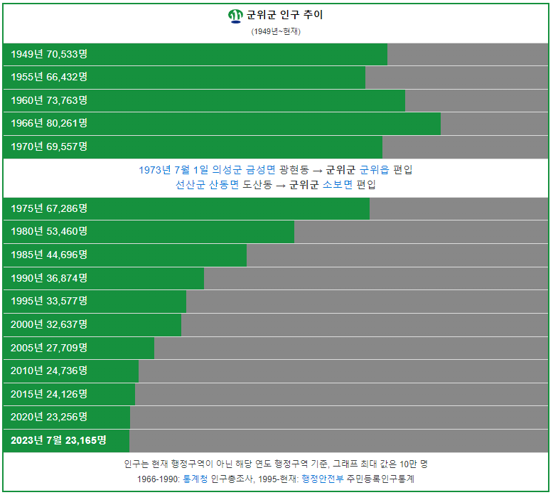 군위군 인구는 1949년 7만명 이었습니다. 그리고 1966년 인구가 처음으로 8만명을 돌파했고 이후에 인구가 계속해서 감소했습니다. 2023년 현재 2만명이 군위군에 거주하고 있습니다.