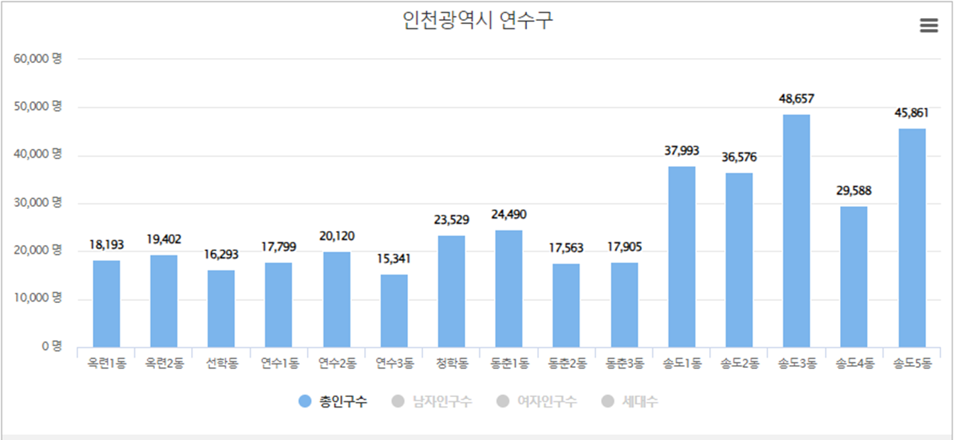 연수구에서 송도3동이 인구가 가장 많으며 인구는 48,657명, 세대수는 19,048입니다. 두번째로는 송도5동 인구가 많고 인구 45,861명, 세대수는 17,259입니다. 세번째는 송도1동으로 인구는 37,993, 세대수는 15,464입니다.