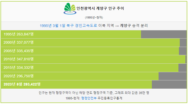 계양구 인구는 1995년 26만명 이었습니다. 그리고 2000년 인구가 처음으로 30만명을 돌파했고 이후에 인구가 계속해서 감소했습니다. 2023년 현재 28만명이 계양구에 거주하고 있습니다.