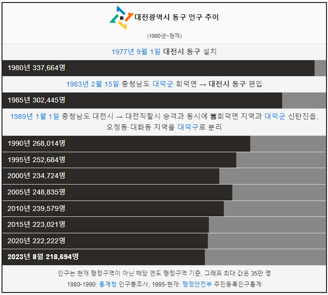 동구 인구는 1980년 33만명 이었습니다. 그리고 2000년 인구가 처음으로 25만명 이하가 되었고 이후에도 인구가 계속해서 감소했습니다. 2023년 현재 21만명이 동구에 거주하고 있습니다.