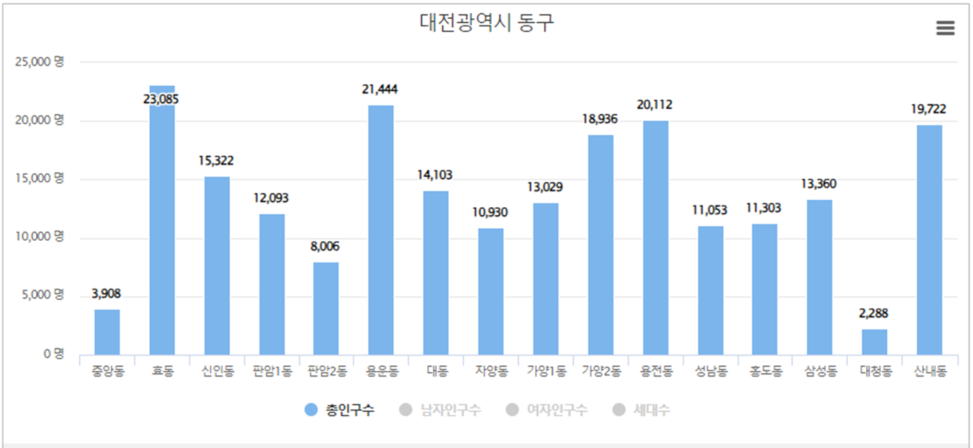 동구에서 효동이 인구가 가장 많으며 인구는 23,085명, 세대수는 9,042입니다. 두번째로는 용운동 인구가 많고 인구 21,444명, 세대수는 10,366입니다. 세번째는 용전동으로 인구는 20,112, 세대수는 11,742입니다.