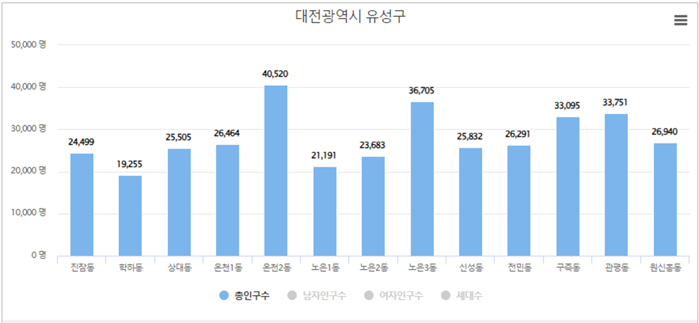 유성구에서 온천2동이 인구가 가장 많으며 인구는 40,520명, 세대수는 21,441입니다. 두번째로는 노은3동 인구가 많고 인구 36,705명, 세대수는 14,146입니다. 세번째는 관평동으로 인구는 33,751, 세대수는 12,634입니다.