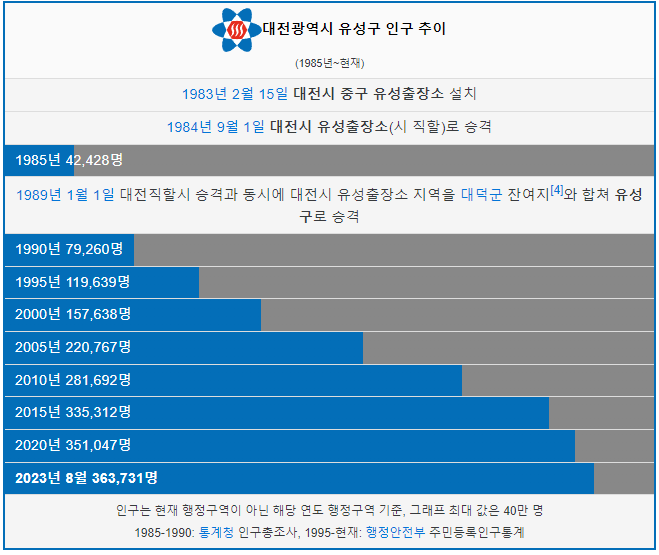유성구 인구는 1985년 4만명 이었습니다. 그리고 2015년 인구가 처음으로 30만명 이상이 되었고 이후에도 인구가 계속해서 증가했습니다. 2023년 현재 36만명이 유성구에 거주하고 있습니다.