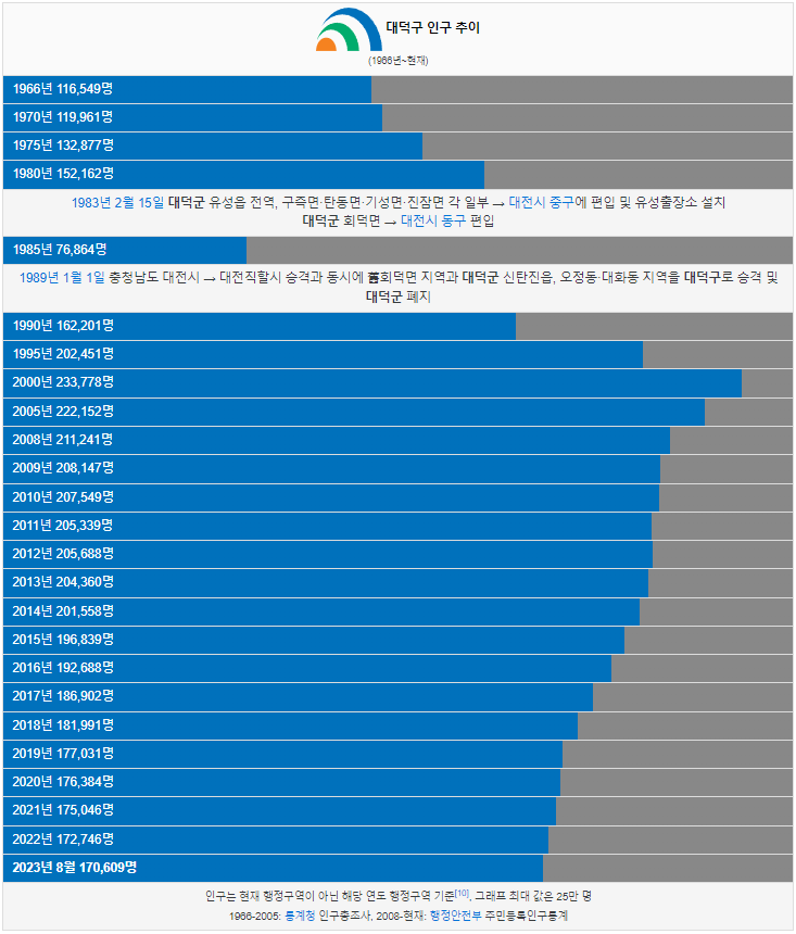 대덕구 인구는 1966년 11만명 이었습니다. 그리고 2000년 인구가 처음으로 23만명 이상이 되었고 이후에 인구가 계속해서 감소했습니다. 2023년 현재 17만명이 대덕구에 거주하고 있습니다.