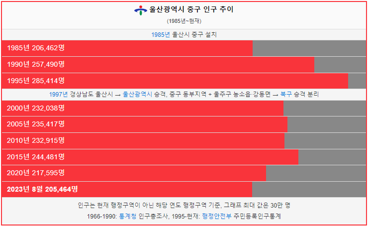 중구 인구는 1985년 20만명 이었습니다. 그리고 1995년 인구가 처음으로 28만명 이상이 되었고 이후에 인구가 계속해서 감소했습니다. 2023년 현재 20만명이 중구에 거주하고 있습니다.