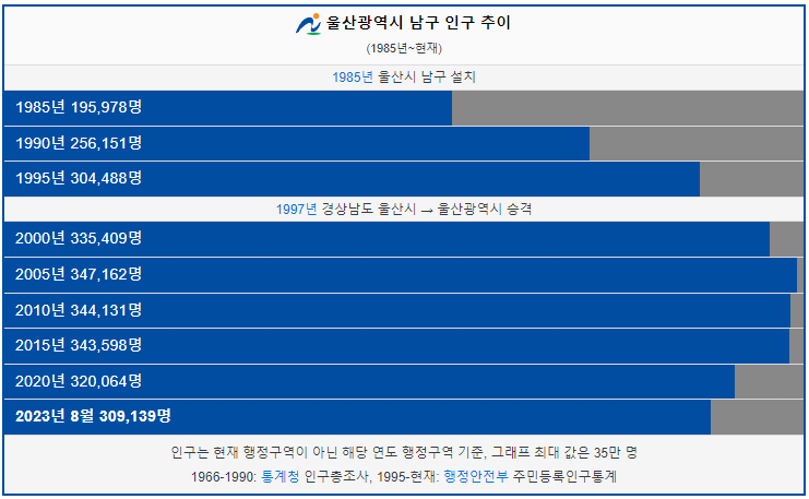 남구 인구는 1985년 19만명 이었습니다. 그리고 2005년 인구가 처음으로 34만명 이상이 되었고 이후에 인구가 계속해서 감소했습니다. 2023년 현재 30만명이 남구에 거주하고 있습니다.