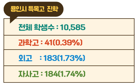 2022년 기준 용인시(수지) 지역에는 50개 중학교가 있고 중학교 학생수는 10,585명입니다. 전체 학생 중 0.39%인 41명이 과학고에 진학했고 1.73%인 183명이 외국어고에 진학했습니다. 그리고 1.74%인 184명이 자립형 사립고에 진학했습니다. 전체 학생수 10,585명 중 3.85%인 408명이 특목고에 진학했습니다.
