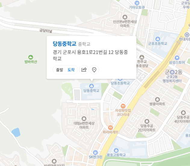 군포시에서 두 번째로 특목고에 많이 진학한 학교는 당동중학교로 경기도 군포시 용호1로21번길 12번지에 위치합니다. 당동중학교의 학생수는 312명이며 과학고는 2명, 외고는 7명, 자사고에는 8명이 진학했습니다. 당동중학교의 전체 학생중 5.45%인 17명이 특목고에 진학했습니다.