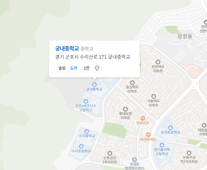 군포시에서 특목고에 가장 많이 진학한 학교는 궁내중학교로 경기도 군포시 수리산로 171번지에 위치합니다. 궁내중학교의 학생수는 284명이며 과학고는 2명, 외고는 19명, 자사고에는 8명이 진학했습니다. 궁내중학교의 전체 학생 중 10.21%인 29명이 특목고에 진학했습니다.