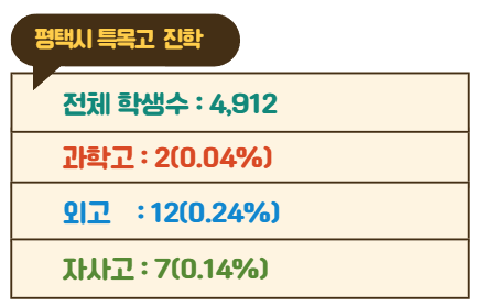 2022년 기준 평택시(고덕) 지역에는 25개 중학교가 있고 중학교 학생수는 4,912명입니다. 전체 학생 중 0.04%인 2명이 과학고에 진학했고 0.24%인 12명이 외국어고에 진학했습니다. 그리고 0.14%인 7명이 자립형 사립고에 진학했습니다. 전체 학생수 4,912명 중 0.43%인 21명이 특목고에 진학했습니다.