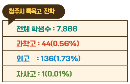 2022년 기준 청주시 지역에는 47개 중학교가 있고 중학교 학생수는 7,866명입니다. 전체 학생 중 0.56%인 44명이 과학고에 진학했고 1.73%인 136명이 외국어고에 진학했습니다. 그리고 0.01%인 1명이 자립형 사립고에 진학했습니다. 전체 학생수 7,866명 중 2.3%인 181명이 특목고에 진학했습니다.