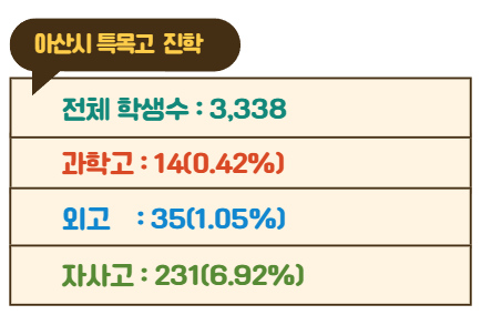 2022년 기준 아산시 지역에는 19개 중학교가 있고 중학교 학생수는 3,338명입니다. 전체 학생 중 0.42%인 14명이 과학고에 진학했고 1.05%인 35명이 외국어고에 진학했습니다. 그리고 6.92%인 231명이 자립형 사립고에 진학했습니다. 전체 학생수 3,338명 중 8.39%인 280명이 특목고에 진학했습니다.