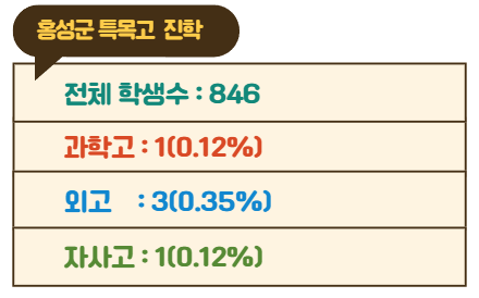2022년 기준 홍성군 지역에는 10개 중학교가 있고 중학교 학생수는 846명입니다. 전체 학생 중 0.12%인 1명이 과학고에 진학했고 0.35%인 3명이 외국어고에 진학했습니다. 그리고 0.12%인 1명이 자립형 사립고에 진학했습니다. 전체 학생수 846명 중 0.59%인 5명이 특목고에 진학했습니다.