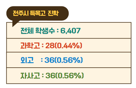 2022년 기준 전주시 지역에는 40개 중학교가 있고 중학교 학생수는 6,407명입니다. 전체 학생 중 0.44%인 28명이 과학고에 진학했고 0.56%인 36명이 외국어고에 진학했습니다. 그리고 0.56%인 36명이 자립형 사립고에 진학했습니다. 전체 학생수 6,407명 중 1.56%인 100명이 특목고에 진학했습니다.