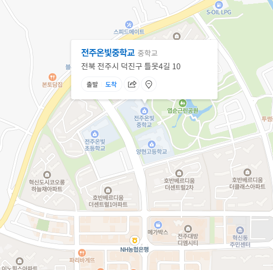 전주시에서 두 번째로 특목고에 많이 진학한 학교는 전주온빛중학교로 전주시 덕진구 틀못4길 10번지에 위치합니다. 전주온빛중학교의 학생수는 383명이며 과학고는 2명, 외고는 5명, 자사고에는 2명이 진학했습니다. 전주온빛중학교의 전체 학생중 2.35%인 9명이 특목고에 진학했습니다.