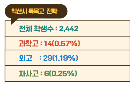 2022년 기준 익산시 지역에는 25개 중학교가 있고 중학교 학생수는 2,442명입니다. 전체 학생 중 0.57%인 14명이 과학고에 진학했고 1.19%인 29명이 외국어고에 진학했습니다. 그리고 0.25%인 6명이 자립형 사립고에 진학했습니다. 전체 학생수 2,442명 중 2.01%인 49명이 특목고에 진학했습니다.