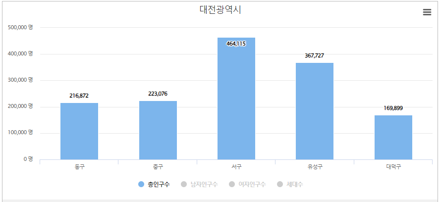 대전시에서 서구 인구가 가장 많으며 인구는 464,115명, 세대수는 218,283입니다. 두번째로는 유성구 인구가 많고 인구 367,727명, 세대수는 168,186입니다. 세번째는 중구로 인구는 223,076명, 세대수는 107,204입니다.