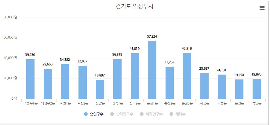 의정부시에서 송산1동 인구가 가장 많으며 인구는 57,224명, 세대수는 24,143입니다. 두번째로는 송산3동 인구가 많고 인구 45,318명, 세대수는 18,043입니다. 세번째는 신곡2동으로 인구는 45,019명, 세대수는 18,891입니다.