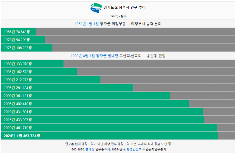 의정부시 인구는 1966년 7만명 이었습니다. 그리고 2005년 처음으로 40만명을 돌파했고 이후 감소없이 인구가 꾸준히 증가하였습니다. 2023년 현재 46만명이 의정부시에 거주하고 있습니다.