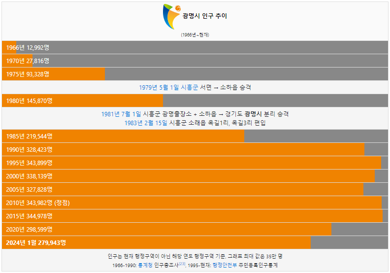 광명시 인구는 1966년 1만명 이었습니다. 그리고 1990년 처음으로 30만명을 돌파했고 2015년 가장 많은 인구인 34만이 거주하였습니다. 2024년 현재 27만명이 광명시에 거주하고 있습니다.