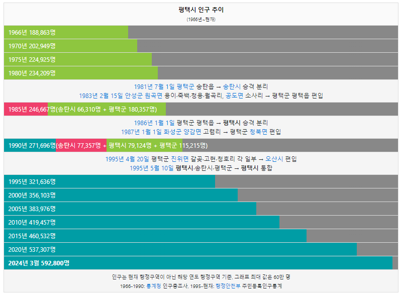 평택시 인구는 1966년 18만명 이었습니다. 그리고 2020년 처음으로 50만명을 돌파했고 이후 감소없이 인구가 꾸준히 증가하였습니다. 2023년 현재 58만명이 평택시에 거주하고 있습니다.