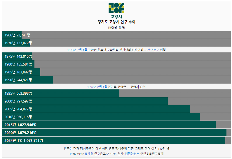 고양시 인구는 1966년 9만명 이었습니다. 그리고 2015년 처음으로 100만명을 돌파했고 이후 감소없이 인구가 꾸준히 증가하였습니다. 2024년 현재 107만명이 고양시에 거주하고 있습니다.