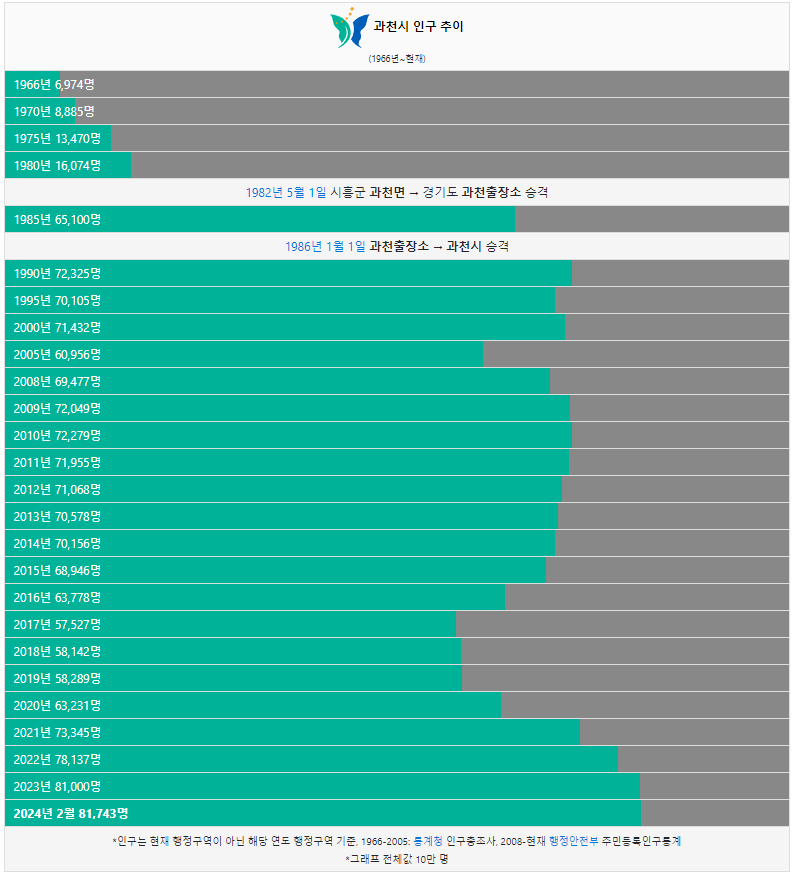 과천시 인구는 1966년 6천명 이었습니다. 그리고 1985년 처음으로 6만명을 돌파했고 1990년 가장 많은 인구인 7만이 거주하였습니다. 2024년 현재 8만명이 과천시에 거주하고 있습니다.