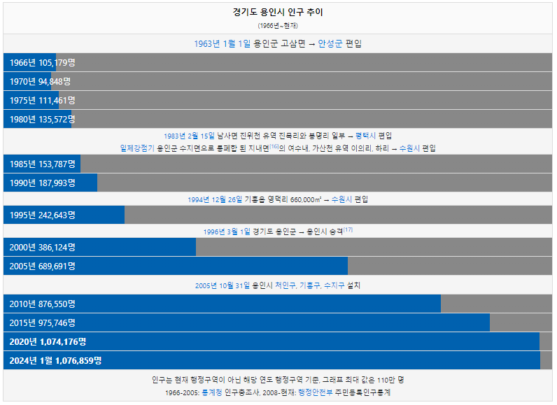 용인시 인구는 1966년 10만명 이었습니다. 그리고 2005년 처음으로 50만명을 돌파했고 이후 감소없이 인구가 꾸준히 증가하였습니다. 2024년 현재 107만명이 용인시에 거주하고 있습니다.
