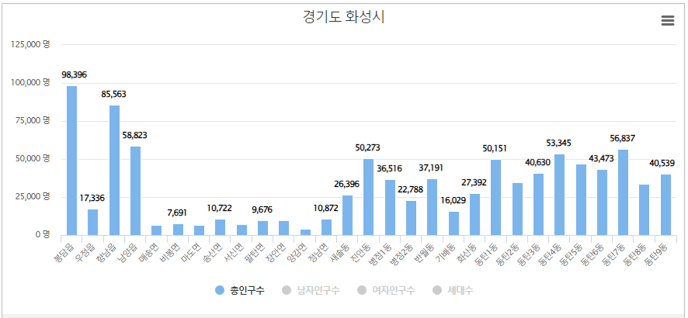 화성시에서 봉담읍 인구가 가장 많으며 인구는 98,396 명, 세대수는 41,281 입니다. 두번째로는 향남읍 인구가 많고 인구 85,563 명, 세대수는 40,173 입니다. 세번째는 남양읍으로 인구는 58,823 명, 세대수는 29,086 입니다.