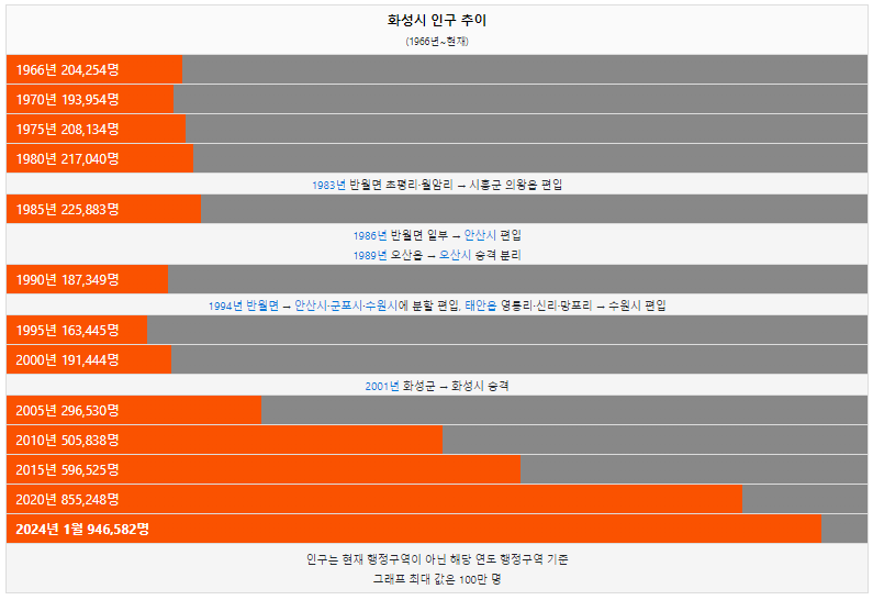 화성시 인구는 1966년 20만명 이었습니다. 그리고 2010년 처음으로 50만명을 돌파했고 이후 감소없이 인구가 꾸준히 증가하였습니다. 2024년 현재 94만명이 화성시에 거주하고 있습니다.