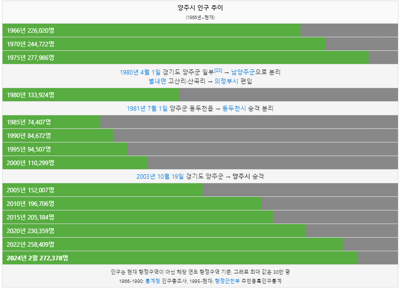 양주시 인구는 1966년 22만명 이었습니다. 1975년 27만명을 돌파하였으니 이후 양주군 일부가 남양주시로 분리되면서 인구가 크게 감소하였습니다. 2024년 현재 27만명이 양주시에 거주하고 있습니다.