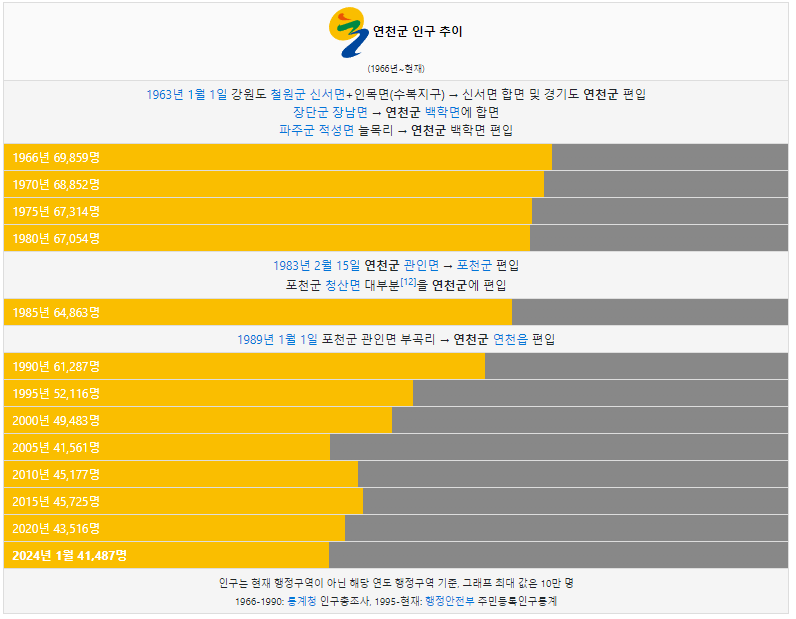 연천군 인구는 1966년 6만명 이었습니다. 그리고 2000년 처음으로 5만명 이하로 인구가 감소했습니다. 2024년 현재 4만명이 연천군에 거주하고 있습니다.