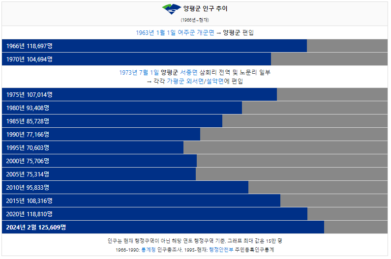 양평군 인구는 1966년 11만명 이었습니다. 이후 1995년까지 인구가 지속적으로 감소했습니다. 그러나 2000년 초부터 인구가 지속적으로 증가하였습니다. 2024년 현재 12만명이 양평군에 거주하고 있습니다.