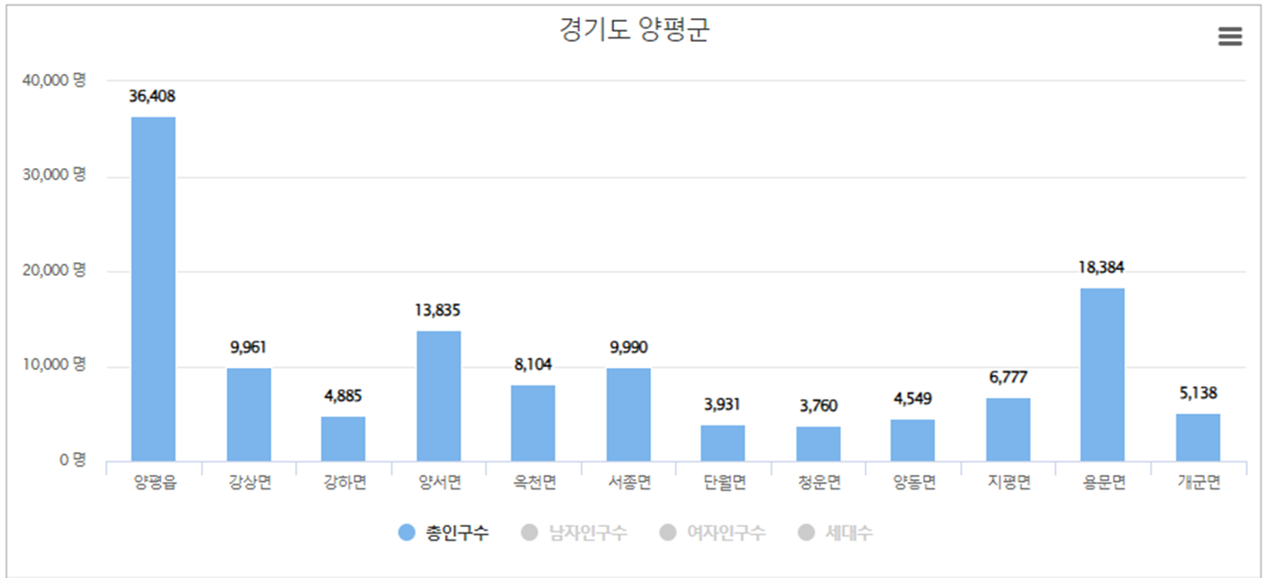 양평군에서 양평읍 인구가 가장 많으며 인구는 36,408 명, 세대수는 16,689 입니다. 두번째로는 용문면 인구가 많고 인구 18,384 명, 세대수는 9,035 입니다. 세번째는 양서면으로 인구는 13,835 명, 세대수는 6,771 입니다.