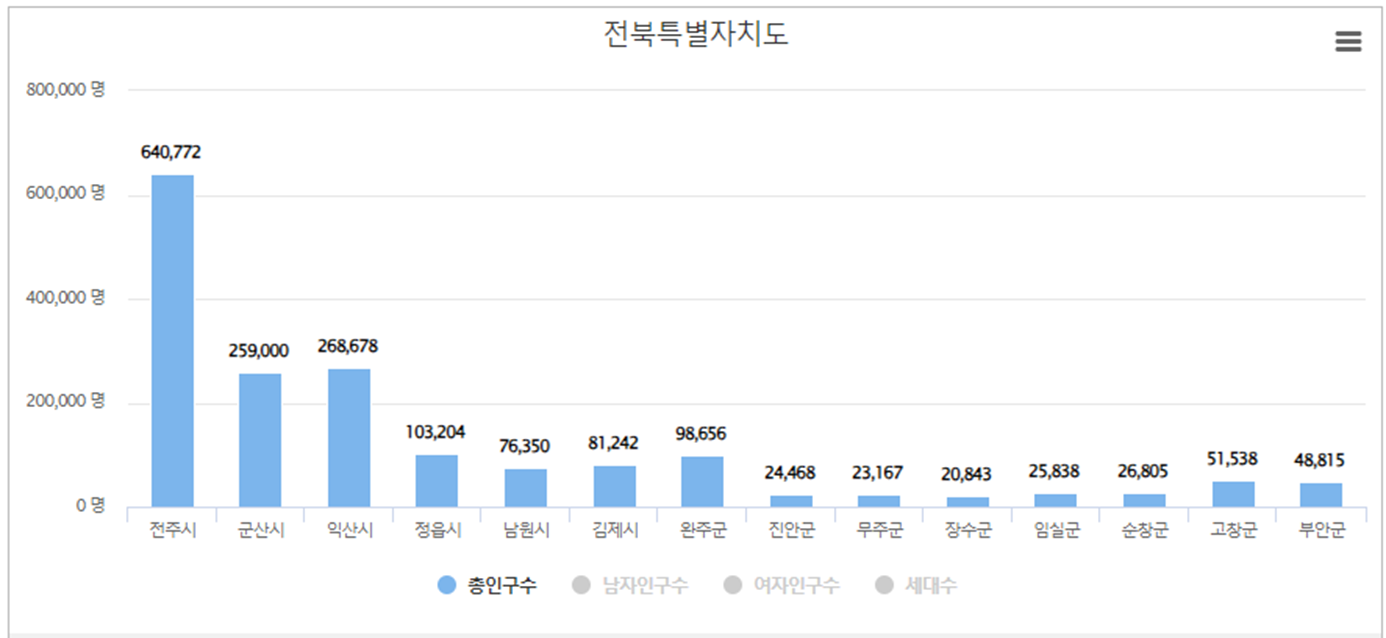 전라북도에서 전주시 인구가 가장 많으며 인구는 640,772 명, 세대수는 296,969 입니다. 두번째로는 익산시 인구가 많고 인구 268,678 명, 세대수는 130,178 입니다. 세번째는 군산시으로 인구는 259,000 명, 세대수는 124,251 입니다.