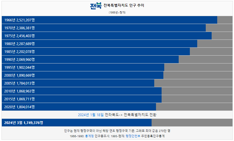 전라북도 인구는 1966년 252만명 이었습니다. 이후 지속적으로 인구가 감소하여 1995년 190만명으로 처음으로 200만명 이하로 감소하였습니다. 2024년 현재 174만명이 전라북도에 거주하고 있습니다.
