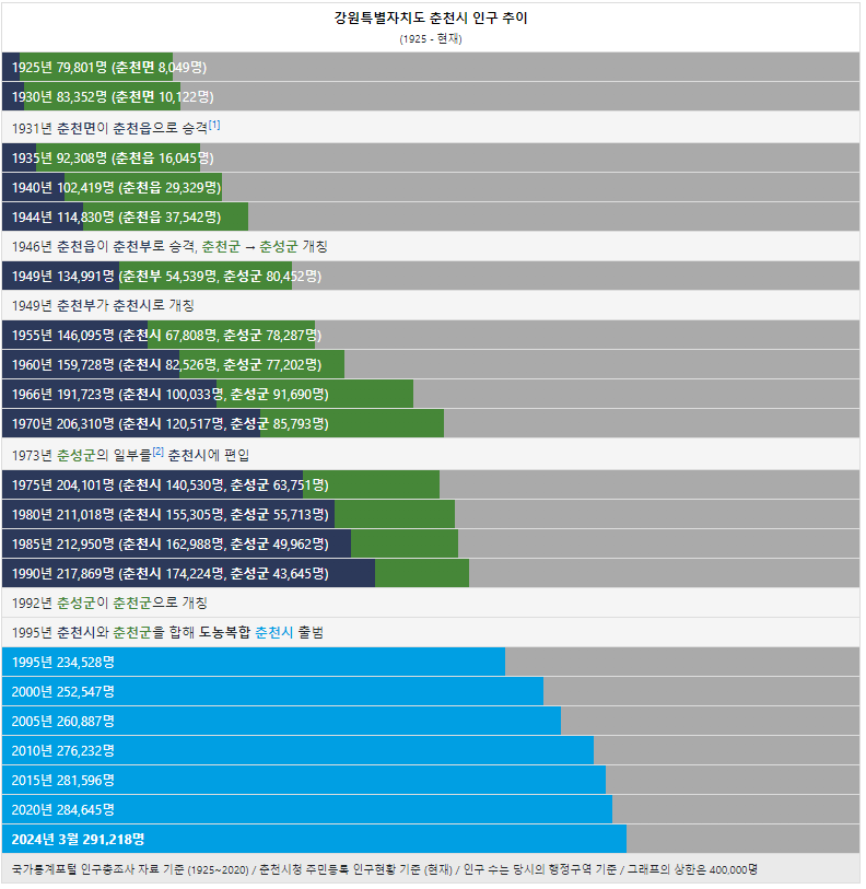 춘천시 인구는 1949년 13만명 이었습니다. 그리고 1970년 처음으로 20만명을 돌파했고 이후 인구가 꾸준히 증가하였습니다. 2024년 현재 29만명이 춘천시에 거주하고 있습니다.