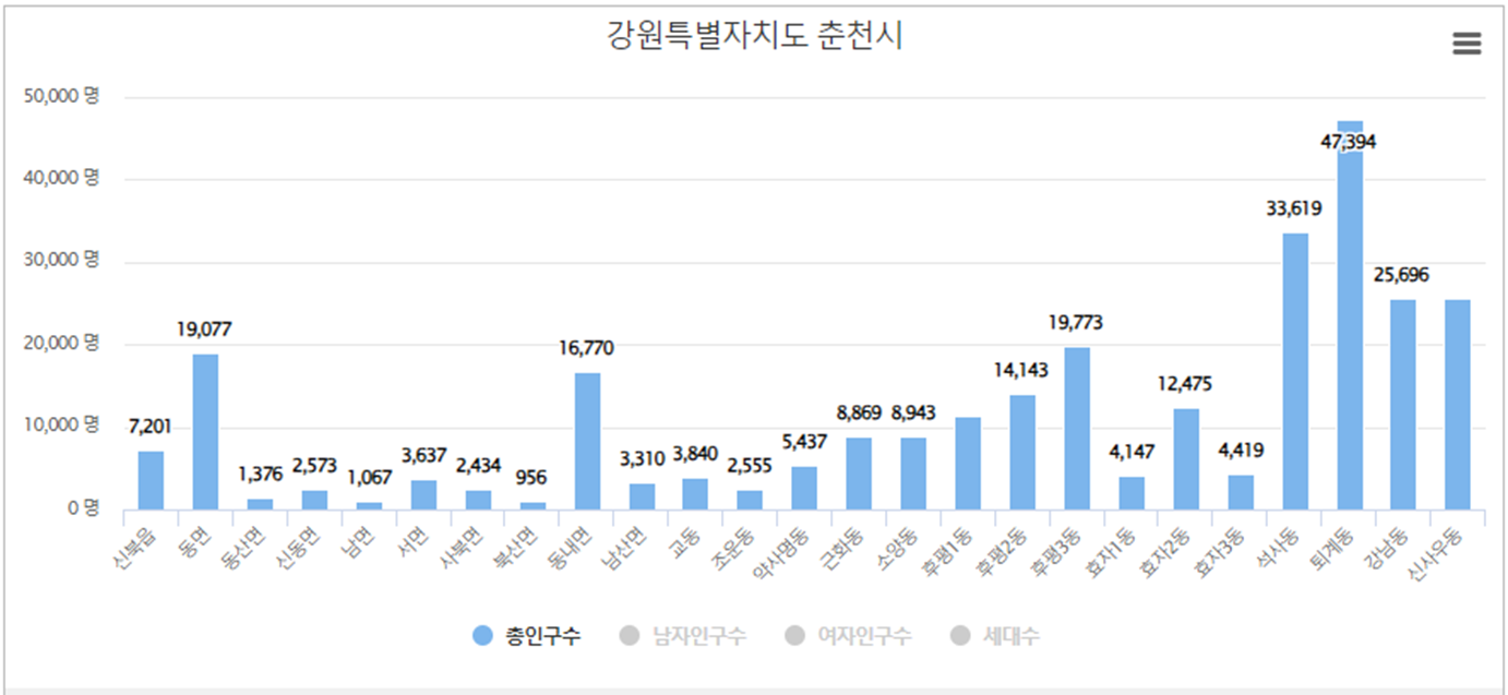 춘천시에서 퇴계동 인구가 가장 많으며 인구는 47,394 명, 세대수는 20,162 입니다. 두번째로는 석사동 인구가 많고 인구 33,619 명, 세대수는 15,349 입니다. 세번째는 강남동으로 인구는 25,696 명, 세대수는 11,044 입니다.